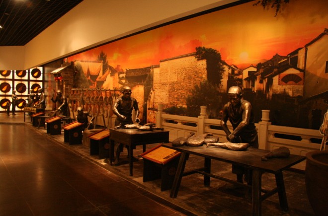 金華火腿為什么能稱為“火琵琶”,其實(shí)并不是兩頭烏的腿生來(lái)就像“琵琶”一樣完美規(guī)整,也不是晾曬的技師用了什么美容整形的神器讓其“看上去很美”。而是在晾曬和發(fā)酵過(guò)程中,不間斷的修形和調(diào)整的結(jié)果。如果在加工過(guò)程中不施以“人工”,而只是任其反復(fù)地腌制和晾曬,當(dāng)火腿自然風(fēng)干的時(shí)候,皮會(huì)顯得縮縮巴巴,而骨頭看上去則直直愣愣的,并沒(méi)有你現(xiàn)在在火腿商店里看到的那樣“光鮮有型”。所以在火腿經(jīng)過(guò)嚴(yán)格的腌制之后,就要開(kāi)始為其修形了,首先是要將火腿放在水中浸泡10個(gè)小時(shí)左右,要將肉皮完全泡軟,目的是為了能用竹刷將皮面、肉面和豬爪部分的細(xì)小泥污統(tǒng)統(tǒng)刷洗干凈。之后便進(jìn)入了晾曬環(huán)節(jié),這是很重要的定型環(huán)節(jié),其一是在日曬過(guò)程中,腿面基本干燥變硬時(shí),加蓋廠印、商標(biāo),并隨之進(jìn)行整形。其二是把火腿放在絞形凳上,絞直腳骨,錘平關(guān)節(jié),捏攏小蹄,絞彎腳爪,捧攏腿心,使之呈豐滿狀。