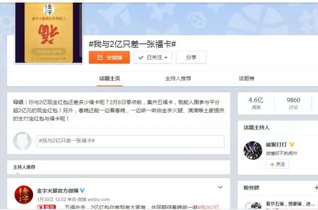 自前幾天支付寶將“集5福,搶2億+紅包”的活動規則公布后,一時間,有關福卡換贈的話題強行霸屏。在有金字粉絲集齊了五福后,金字順勢在微博平臺上策劃的#我與2億只差一張福卡#的微話題就引發了高達4.6億的閱讀量,網友們通過點贊評論及轉發分享的方式,第一時間表達了自己對于五福福卡和春晚2億紅包的高度期待!